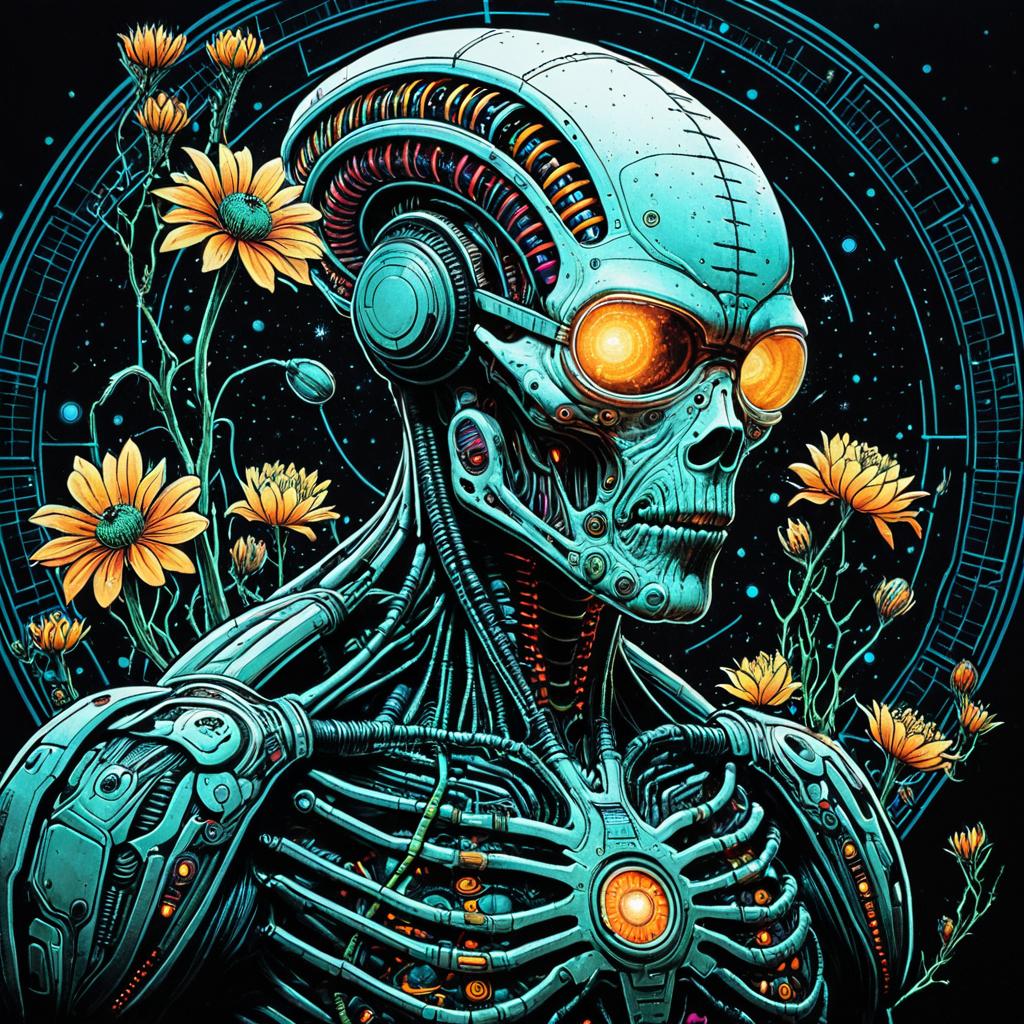Digital artwork of a biopunk scientist cyborg featuring a skeletal robotic body with intricate organic circuitry tattoos. The figure is surrounded by luminous alien flowers glowing in yellow and orange hues, set against a cosmic background with a futuristic circular design. The style combines elements of Josan Gonzalez, Moebius, and H.R. Giger, highlighting a colorful and cinematic sci-fi theme.