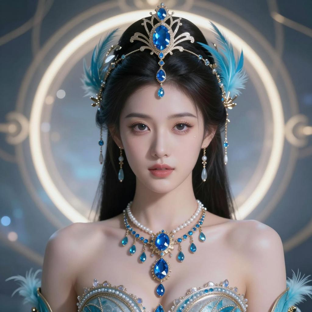 A stunning digital portrait of a woman adorned with ornate blue gemstones and intricate feathered accessories, set against a mystical, glowing circular backdrop. The artwork showcases a high-fantasy style with meticulous detailing in the jewelry and attire, emphasizing her ethereal and regal presence.