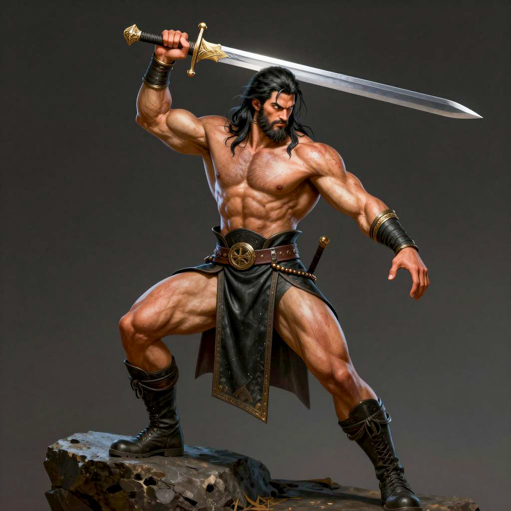 Fucking muscular dude with long black hair and a beard, holding a sword above his head. He's shirtless, wearing a black leather skirt, wrist bracers, and boots. His right arm is raised, left arm is outstretched. He's standing on a rock with intense expression. The dude's body is heavily scarred. He's ready to fucking slice something. The image is a digital illustration with a dark background.