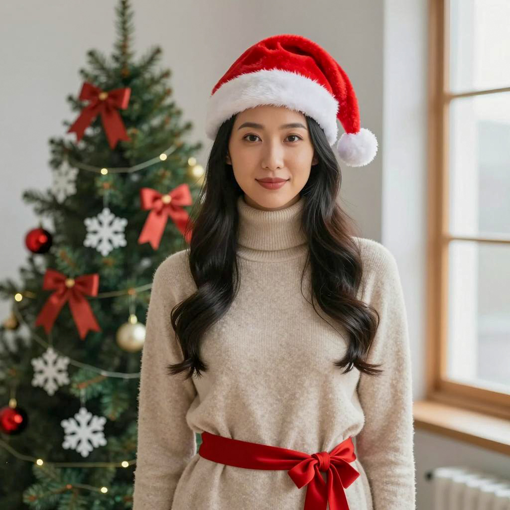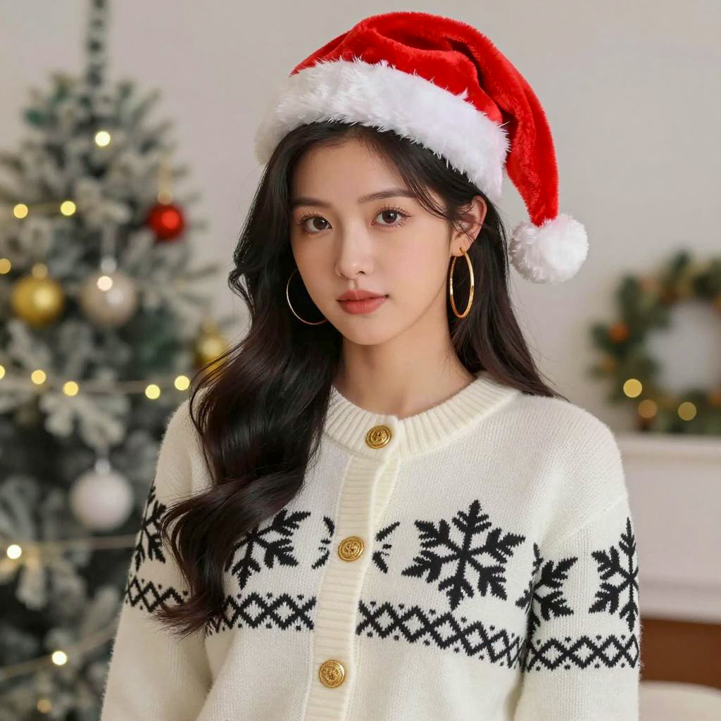 Top christmas outfit costume, photorealistic, young Asian woman, long wavy black hair, wearing Santa hat, white snowflake patterned sweater with gold buttons, large gold hoop earrings, blurred Christmas tree with lights in background, warm indoor lighting, soft focus, festive holiday theme, confident expression, natural makeup
