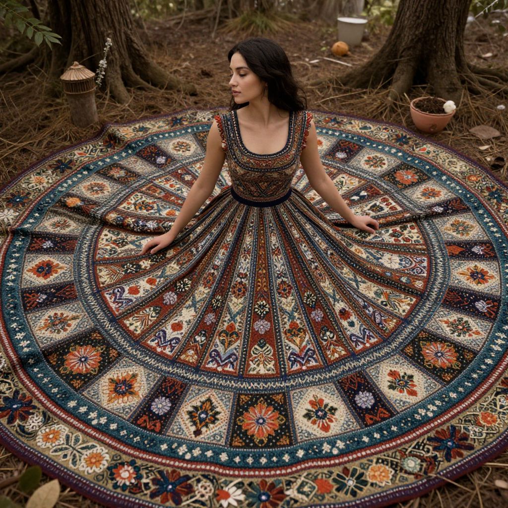 A woman drifts through a dreamlike realm, her dress woven from an endless tapestry of geometric patterns and floral motifs, defying the boundaries between fabric and fantasy.