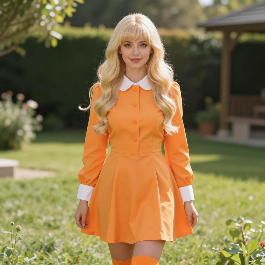 Blondie fancy dress costume, photograph of a blonde woman in an orange dress, long wavy hair, standing in a sunny garden, bright green grass, blurred trees and bushes in the background, orange buttons on the dress, white cuffs, daytime, natural light, soft focus, casual style, woman centered, slight smile, soft makeup, hair bangs, orange socks, realistic, anime-style, T2I generated image