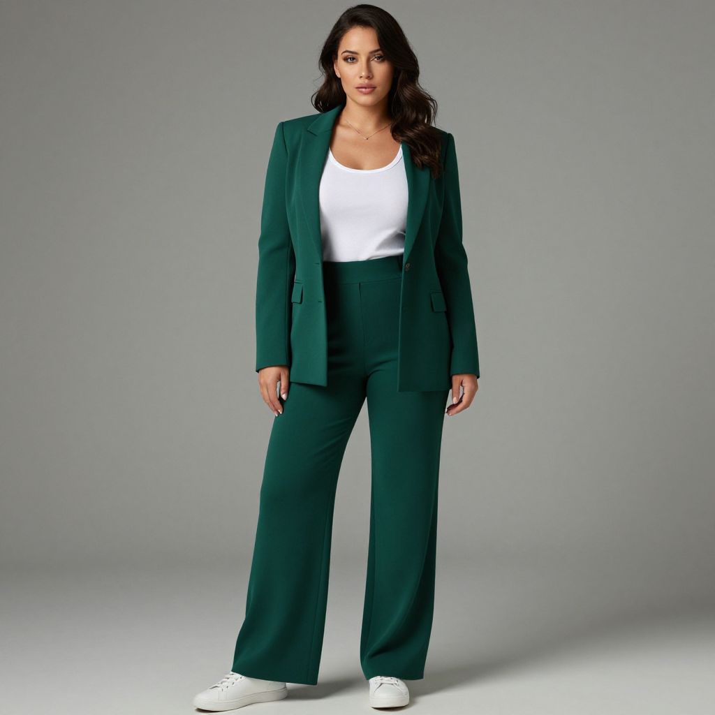 "Woman, modern business casual, emerald green pantsuit, relaxed fit, single-button blazer with flap pockets, long sleeves, white scoop neck t-shirt, high-waisted wide-leg trousers, white low-top sneakers, studio background.. Sexy. Pretty face and beаutiful eyes. Big breasts."