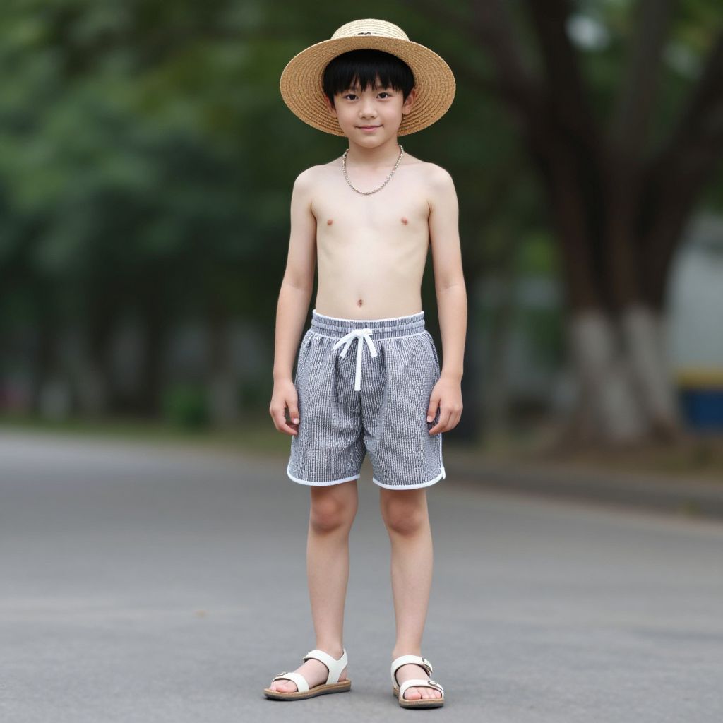 "summer collection costume, 1boy, male focus, solo, hat, sandals, shorts, necklace, outdoors, jewelry, black hair, smile, straw hat, full body, sun hat, looking at viewer, blurry, tree Realistic photo of casual sexy person with pretty face"