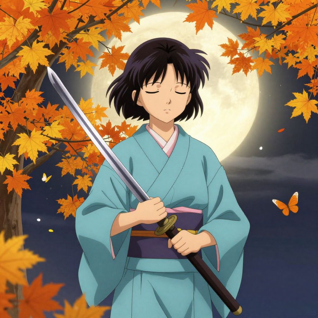 Anime-style illustration of a young woman in a blue kimono holding a sword, standing under an autumn tree with a full moon and butterflies in the dark