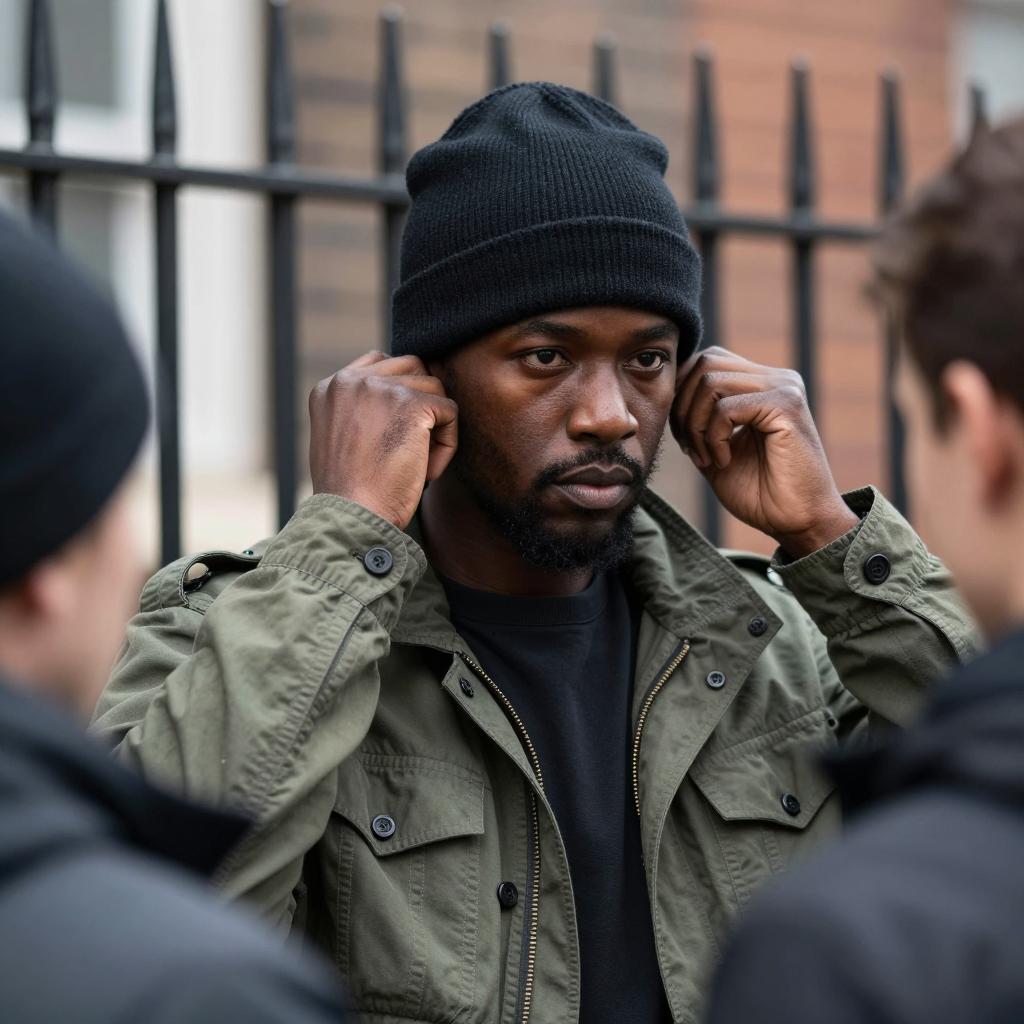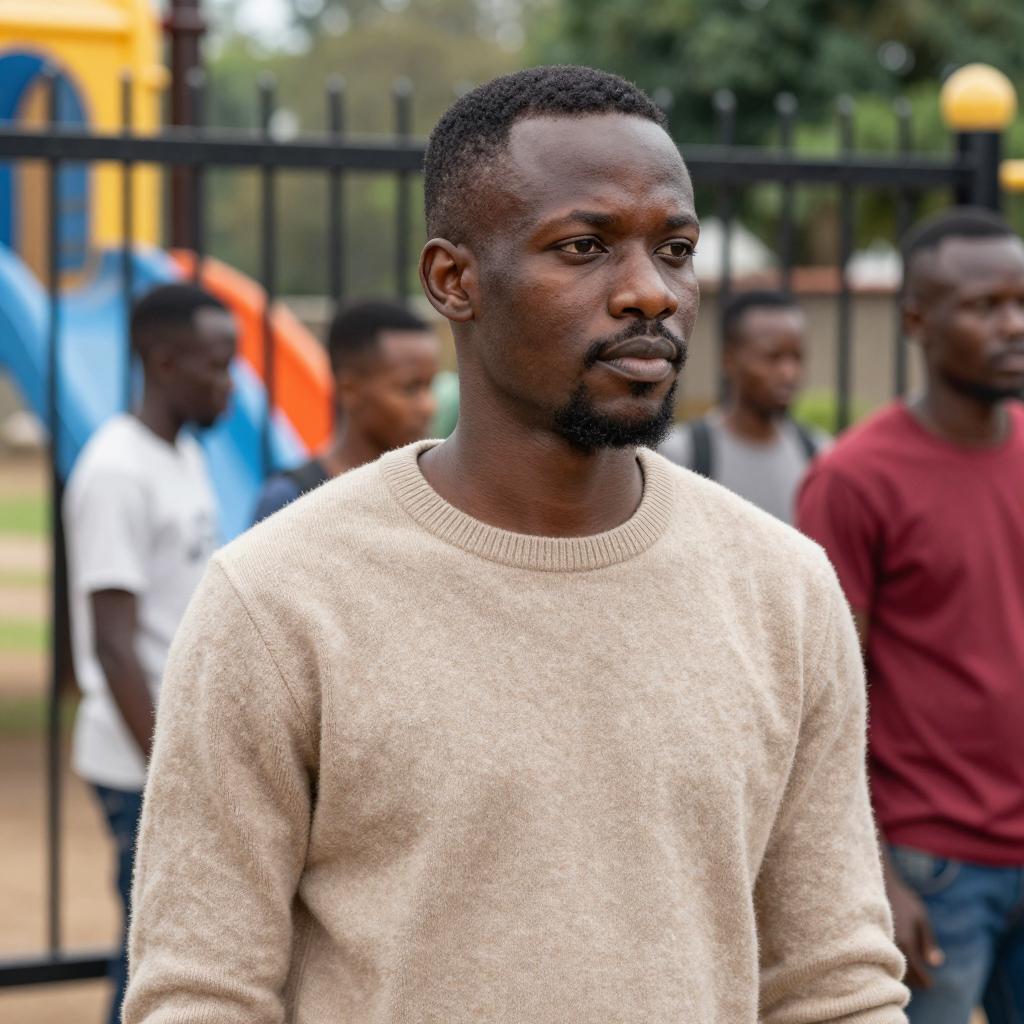 Black man with short hair and mustache wearing beige sweater, standing in foreground. Background has black metal fence, blurred people, colorful slide, and greenery. Medium shot, upper body. Man looks to the right. Several people in background.