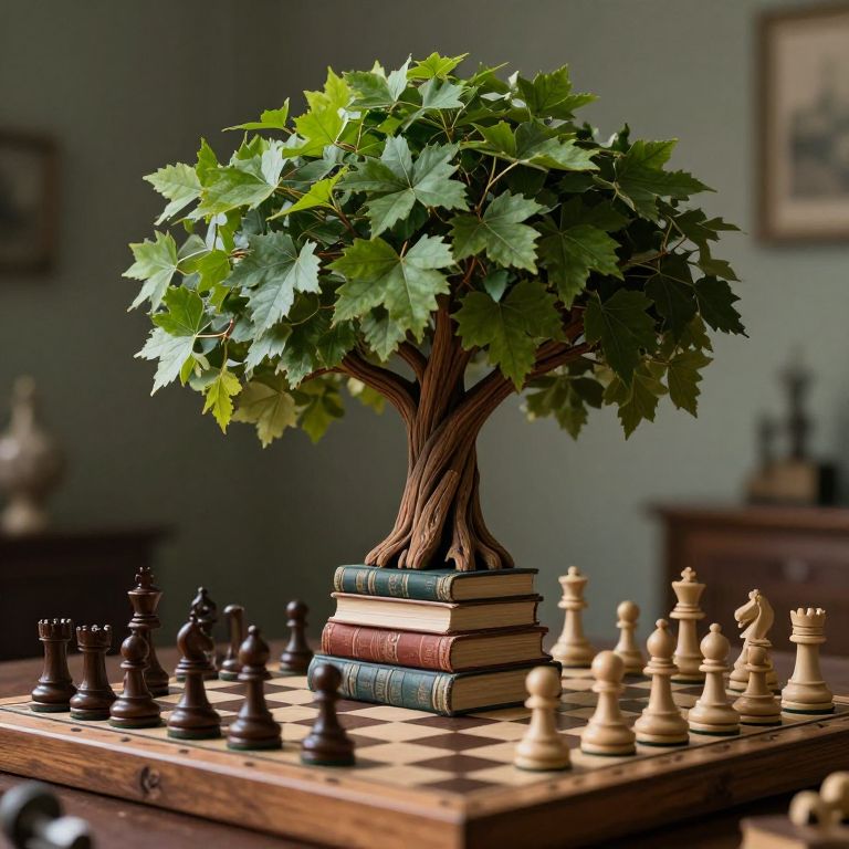 Photograph of a meticulously crafted miniature tree sculpture with green leaves and a twisted brown trunk, standing on a stack of three old, leather-bound books. The tree is centered on a wooden chessboard with alternating black and light wood chess pieces. The background is slightly blurred, featuring a dimly lit room with framed pictures on the wall and a wooden cabinet. The image has a warm, soft-focus effect, emphasizing the tree's detailed texture and the chess pieces' smooth surfaces. The overall style is realistic with a touch of artistic flair.