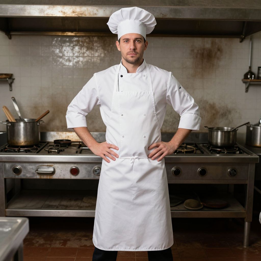 A man dressed as a chef in a dirty kitchen, wearing a white apron and hat, stands confidently with hands on hips.