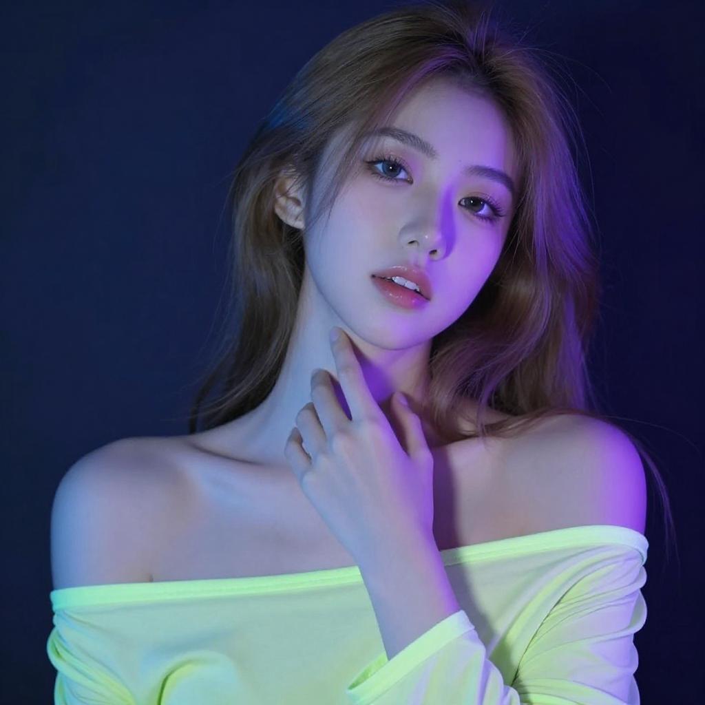 Photograph of a young woman with long, light brown hair, illuminated by blue and purple lights. She wears an off-shoulder, light green top, with her right hand gently touching her neck. Her expression is soft, with slightly parted lips. The background is dark, creating a contrast with the colorful lighting on her face and clothing.