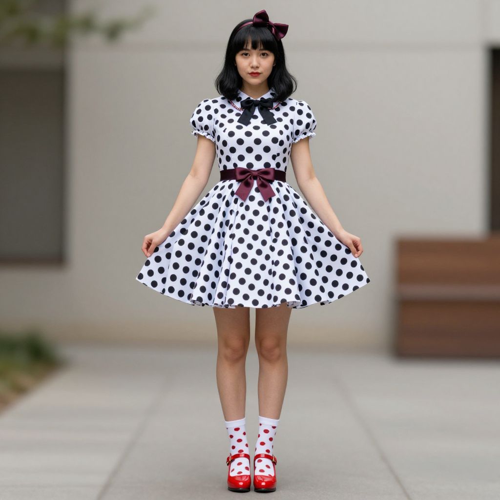 Photograph of an Asian woman with black hair in a bow, wearing a white polka dot dress, red heels, and white polka dot socks