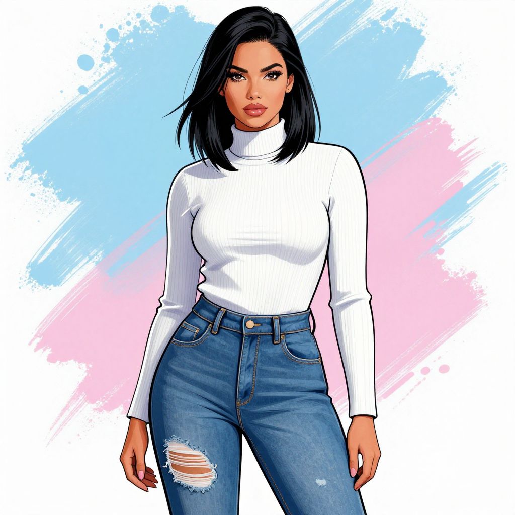 Digital drawing of a confident woman with fair skin and shoulder-length black hair. She's wearing a white, ribbed turtleneck sweater and high-waisted, ripped blue jeans. The background is a blend of light blue and white with pink brushstrokes. She stands with a relaxed posture, looking directly at the viewer. The style is reminiscent of modern comic art with bold lines and vibrant colors.