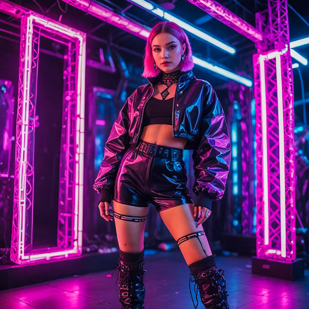 Portrait of a slender young woman with wavy bob haircut wearing a black zip-up crop jacket and matching high-waisted pants made of shiny magenta PVC fabric with lace details. She poses in a nightclub environment illuminated by vibrant magenta and blue neon lights, embodying a cyberpunk rave style. The outfit includes lace stockings and she accessorizes with bold earrings, statement rings, and a choker. The scene is lit with LED lighting, creating a futuristic, edgy atmosphere.
