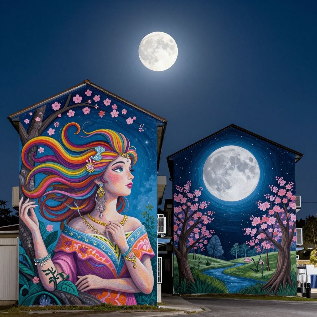 Under the watchful gaze of a luminous moon, two buildings come alive with vibrant murals—a whimsical woman with flowing hair and a cheerful moonlit night adorned with blossoming trees, creating a surreal dialogue between art and architecture.