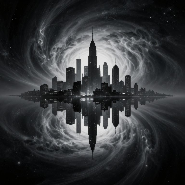 Digital artwork of a city skyline, dominated by a tall, central skyscraper, surrounded by swirling, ethereal white clouds in a black, starry night sky. The buildings are silhouetted in black with reflective water below, creating a mirrored effect. The central skyscraper is the tallest, with surrounding buildings of varying heights. The swirling clouds form a vortex-like pattern around the city, adding a sense of motion and mystique. The overall composition is symmetrical and dramatic, with a high contrast between the dark buildings and the bright, swirling clouds.
