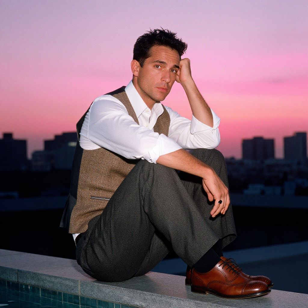 A man, tweed waistcoat in earthy brown, crisp white dress shirt, charcoal gray slacks, brown leather brogues, rooftop pool, city skyline view, vibrant sunset hues, Ilford film stock, contemplative expression Man has masculine face and piercing eyes