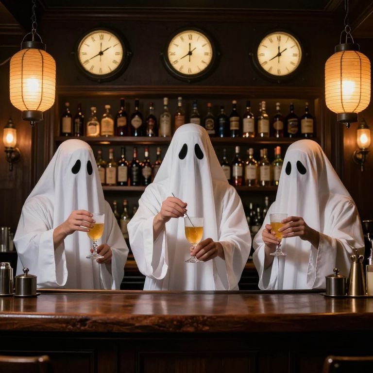 Photograph of three people standing behind a wooden bar counter, dressed in white ghost costumes with black oval eyes. Each ghost holds a glass of golden liquid, possibly a cocktail. The background features a dark wooden shelf filled with various liquor bottles and three round wall clocks displaying different times. Warm, orange-hued paper lanterns hang from the ceiling, casting a soft light. The scene is dimly lit, creating a spooky yet festive atmosphere. The ghosts' hands and glasses are clearly visible, contrasting with the white costumes.