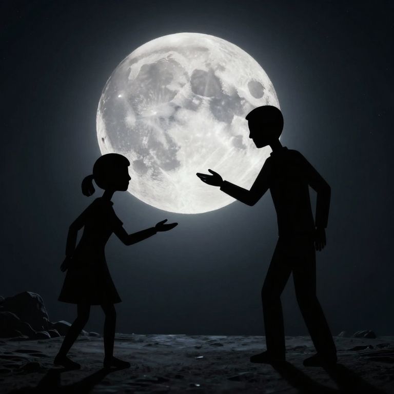 A silhouetted digital illustration of a child and an adult facing each other under a large, bright full moon. The child, with pigtails and a dress, extends an open hand to the right. The adult, with short hair and wearing pants, raises their left hand towards the child. The dark sky and rocky ground create a stark contrast with the glowing, textured moon in the background. The figures are in shadow, emphasizing their outlines and the moon's luminosity. The scene evokes a sense of wonder and connection.