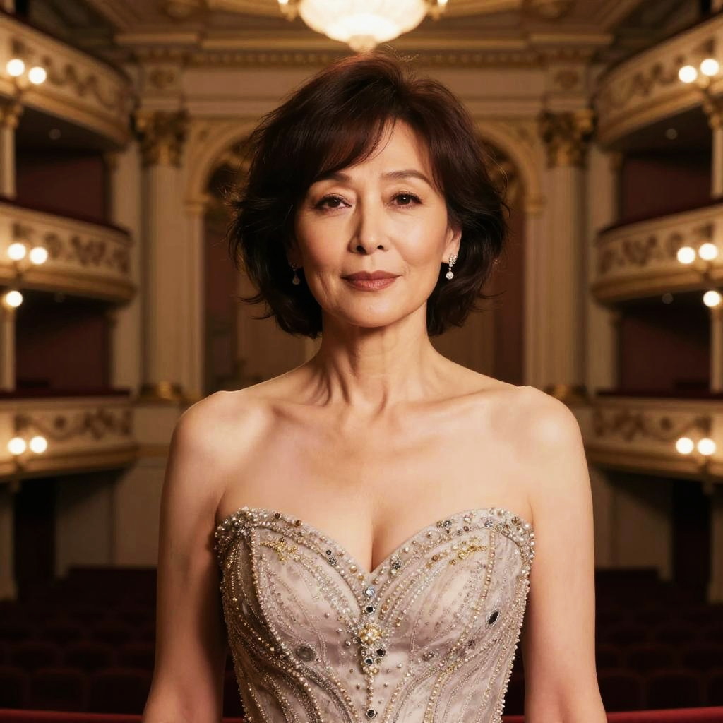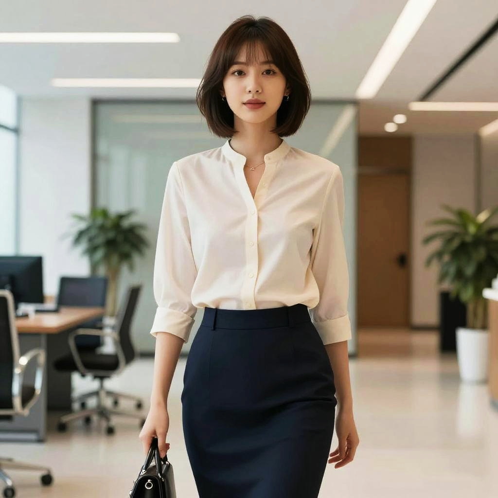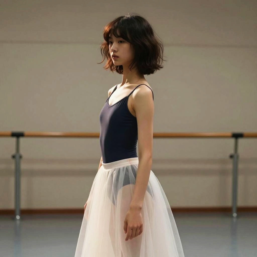 Photograph of an Asian woman with short black hair, wearing a black crop top and black sweatpants, standing in a sunlit urban skate park with