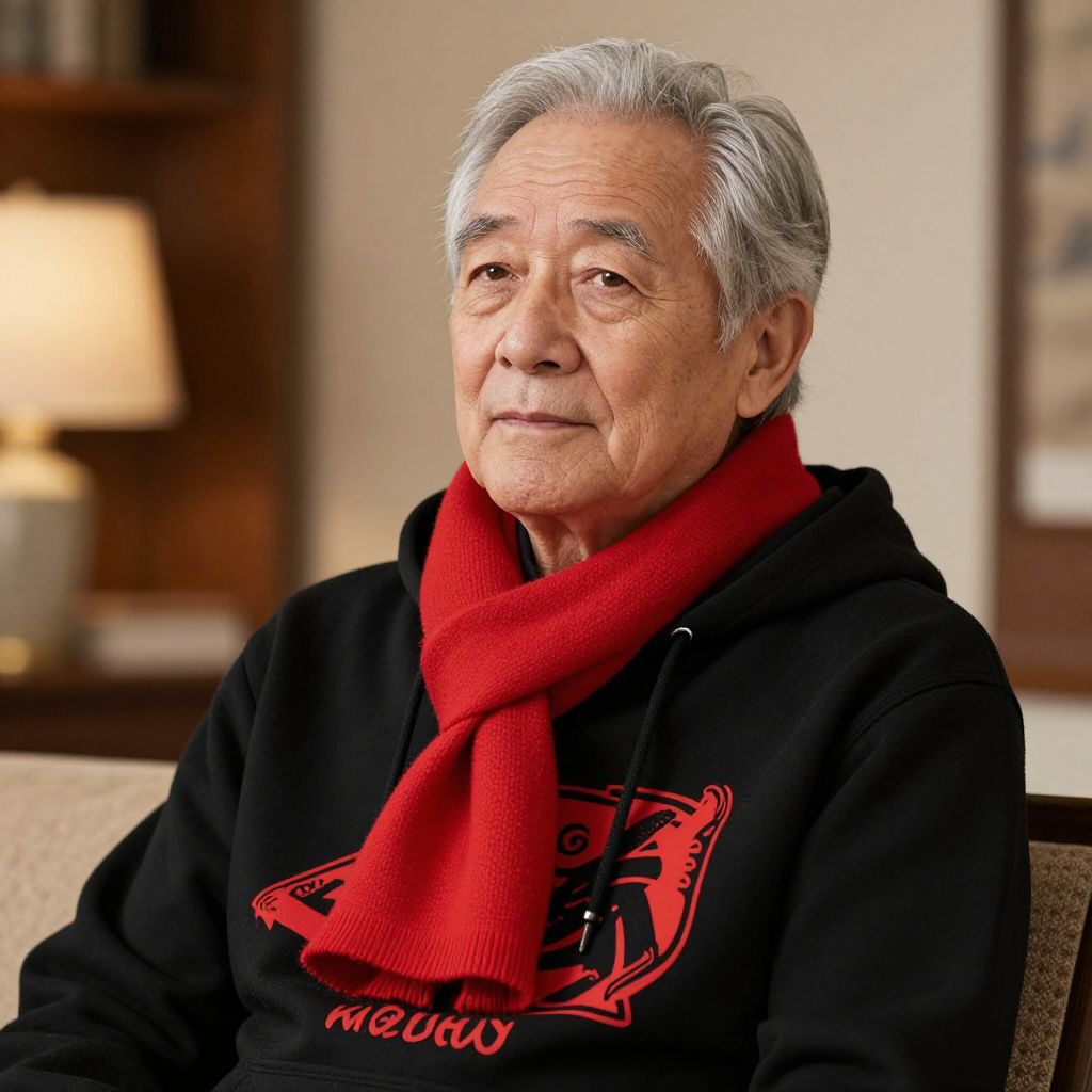 Photograph of an elderly man with gray hair, wearing a black hoodie with red logo and matching red scarf, sitting indoors. Warm, softly lit background