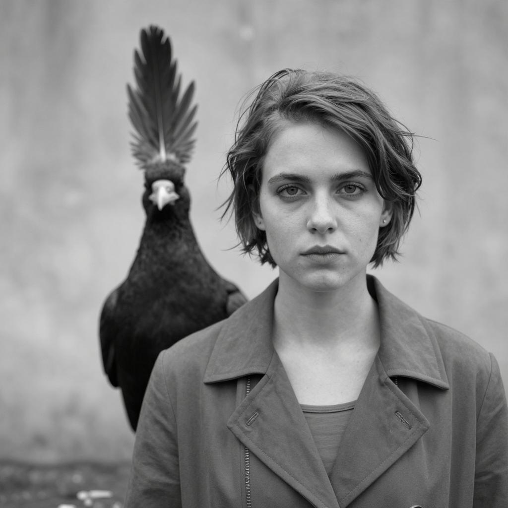 Black and white photograph of a young woman with short, slightly messy hair, wearing a collared jacket over a simple top. She has a serious expression and looks directly at the camera. Behind her, a bird with a large, feathered head is partially visible. The background is a ured, worn wall. The woman is positioned to the right, the bird to the left.
