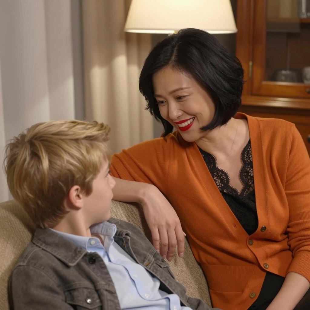 Middle-aged woman with long brown hair and beige shirt leans on table, resting chin on hand, looking at young boy with short black hair and white shirt. Boy leans on table, arms crossed. Wooden chairs, floral tablecloth, yellow and green patterned windows. Background includes kitchen sink and green cabinet. Sunlight filters through windows.