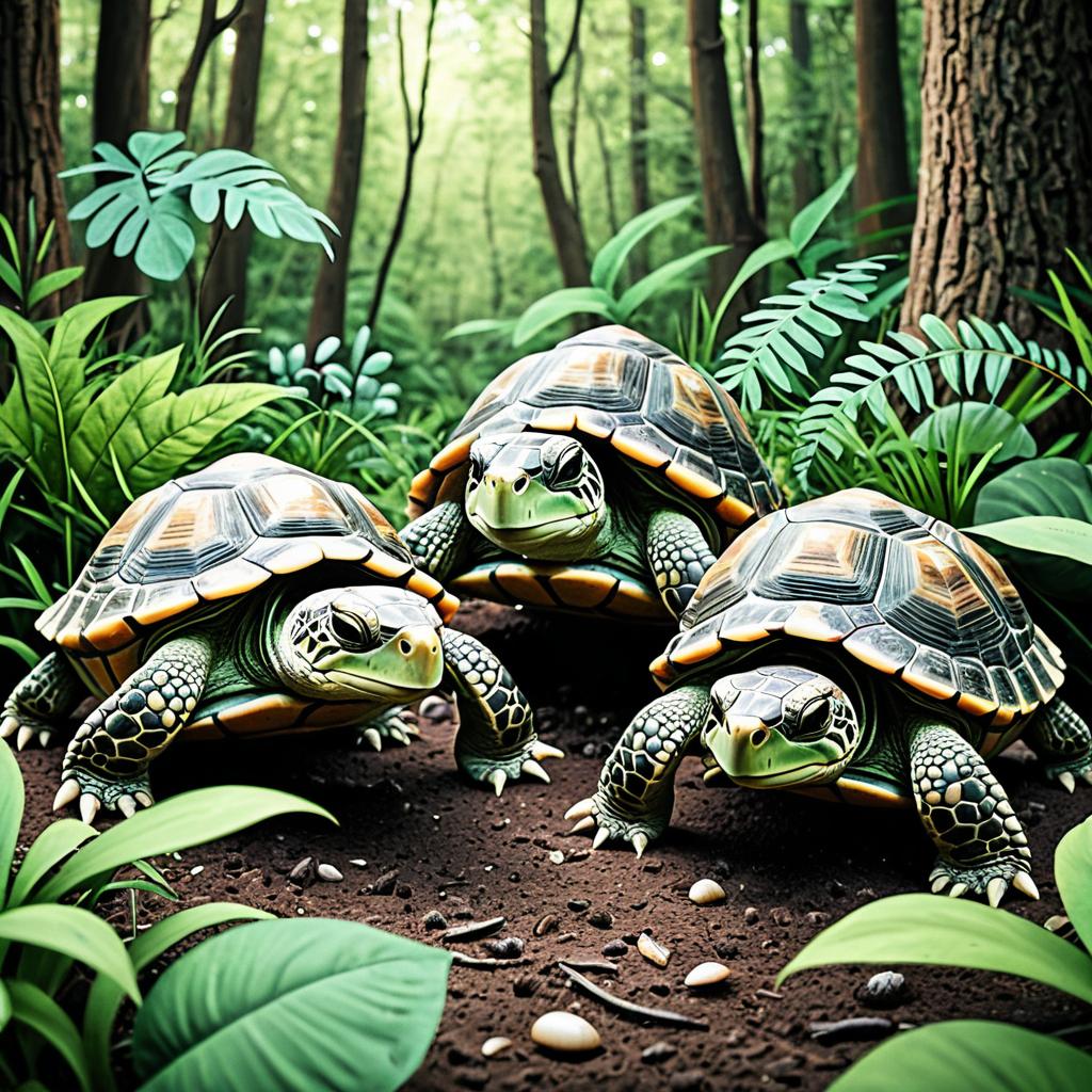 Illustration of three friendly cartoon-style turtles with soft pastel shells and green limbs, set in a whimsical woodland with lush, vibrant vegetation and tall trees. The turtles feature playful and expressive faces, surrounded by rich green foliage and forest floor elements.