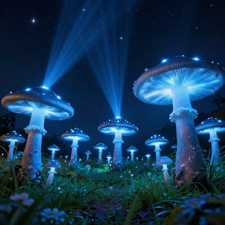 A whimsical meadow brimming with oversized, glowing mushrooms defies gravity as they emit radiant blue beams that pierce the star-studded night sky, creating an otherworldly spectacle where nature and magic intertwine.