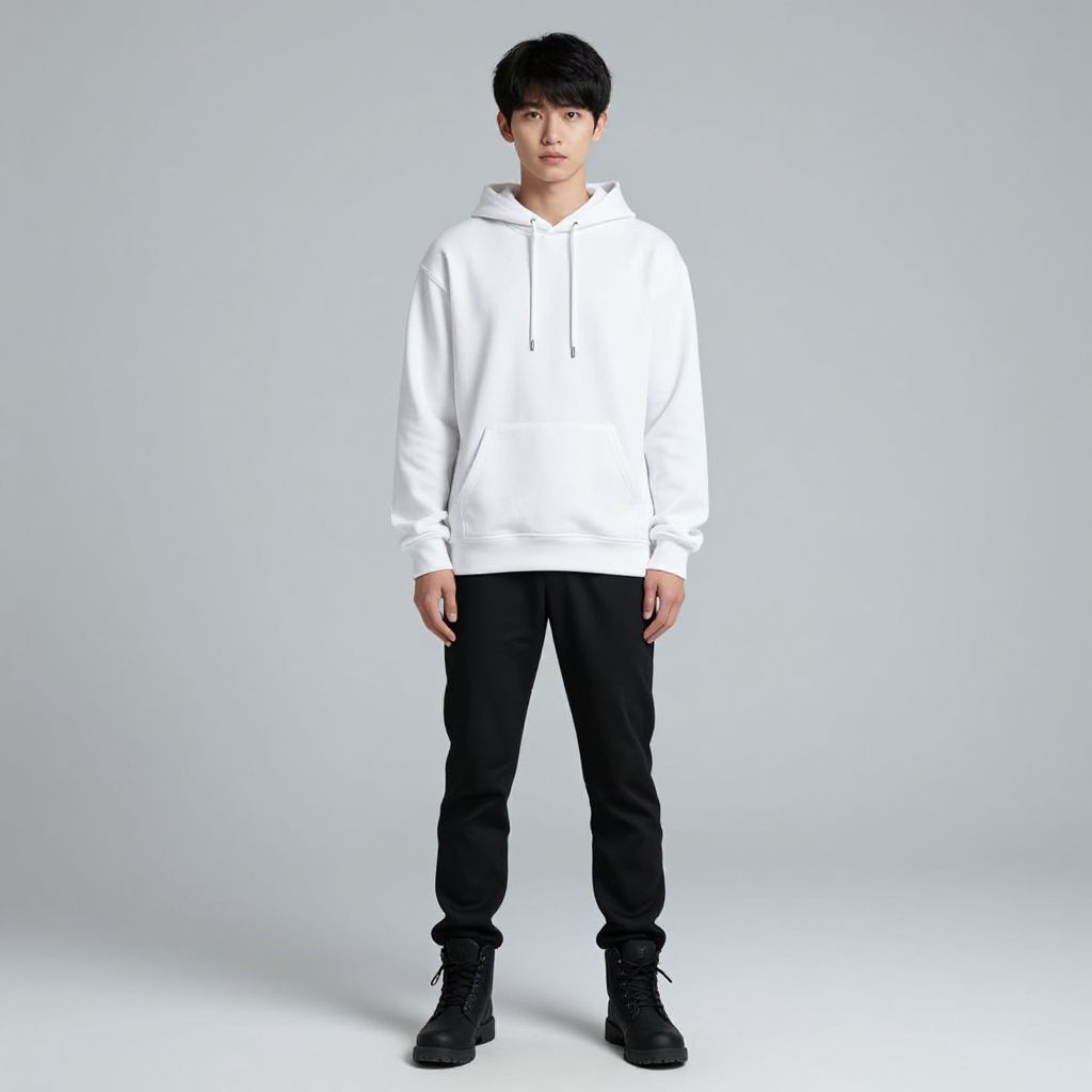 Photograph of a young Asian man with short black hair, standing against a plain light gray background. He wears a white hooded sweatshirt with a drawstring, black loose-fitting pants, and black high-top sneakers. His expression is neutral, and he stands with his hands relaxed by his sides. The lighting is even, highlighting the contrast between his white top and black pants. The overall style is casual and minimalist.