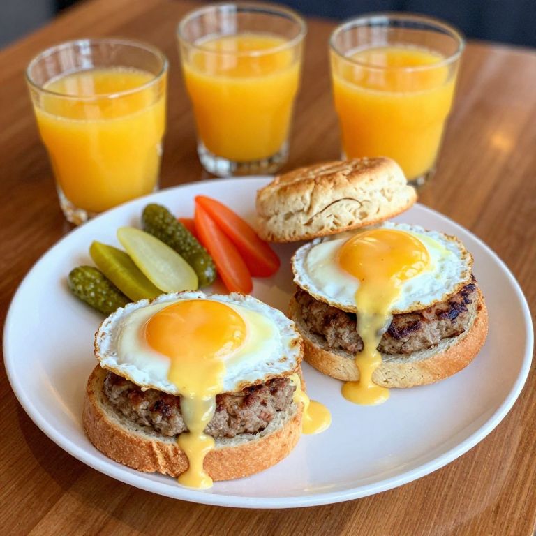 Delicious breakfast plate featuring two open-faced sandwiches with sunny-side-up eggs, sausage patties, and creamy hollandaise sauce, accompanied by vibrant pickled vegetables and a soft biscuit, all served alongside three glasses of orange juice on a polished wooden table.