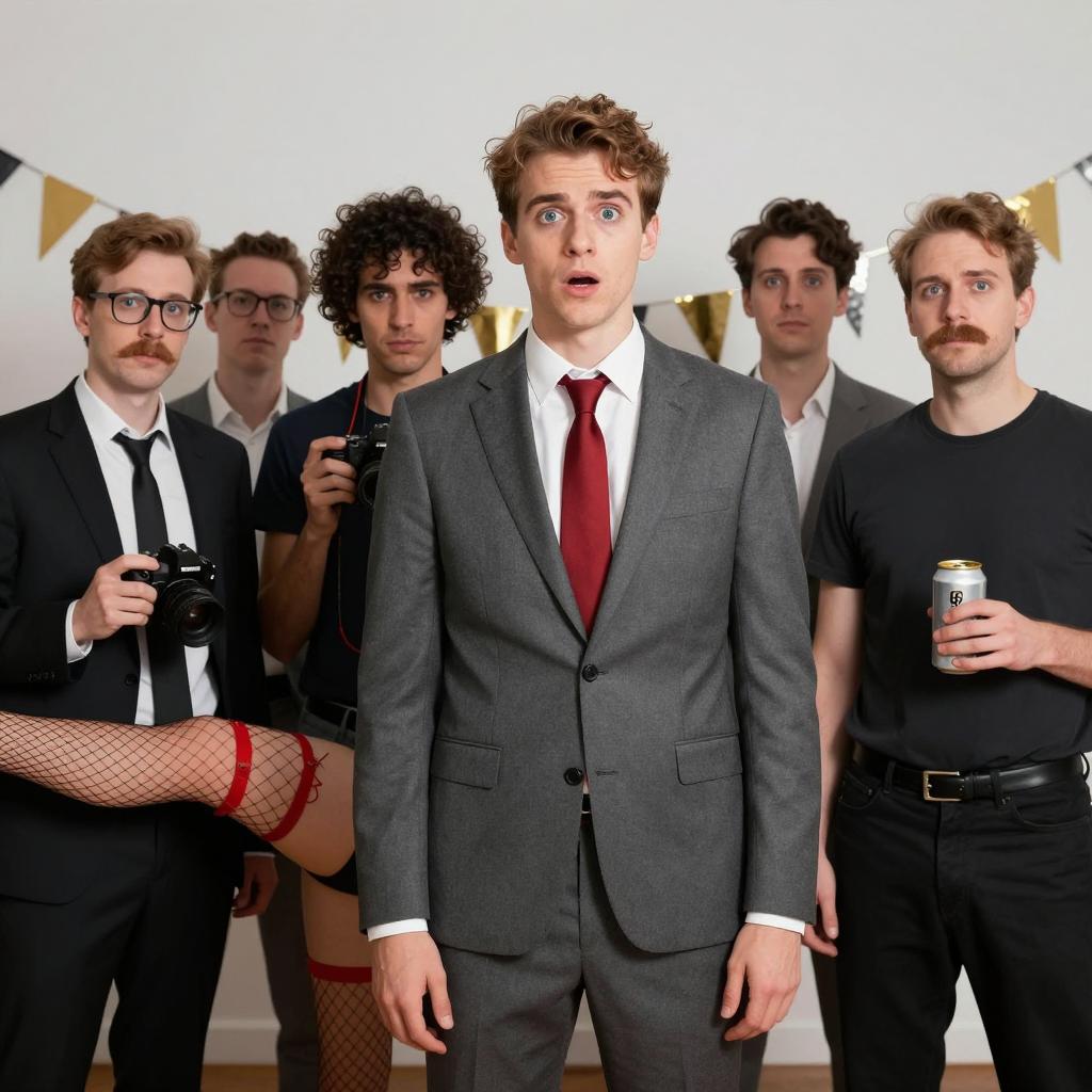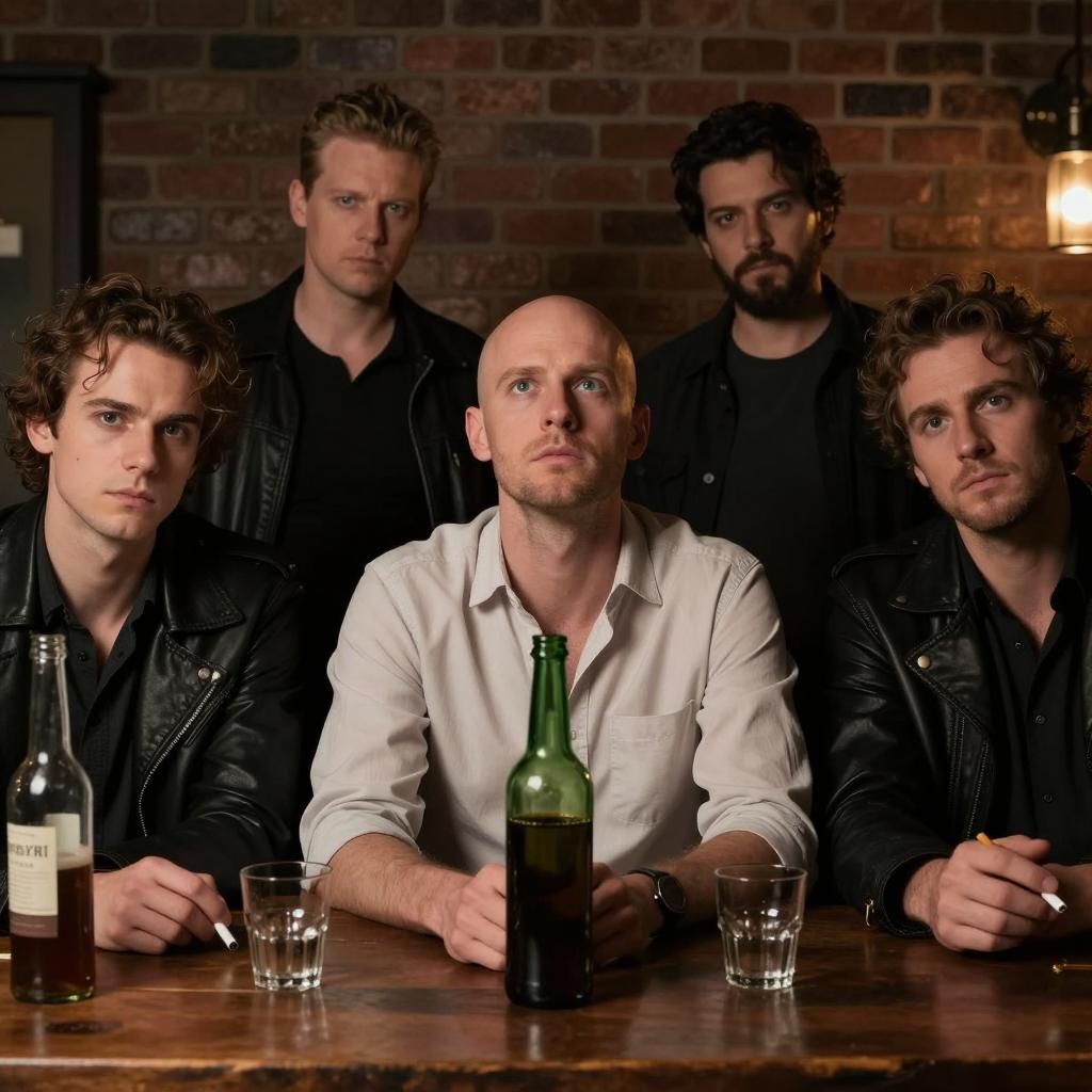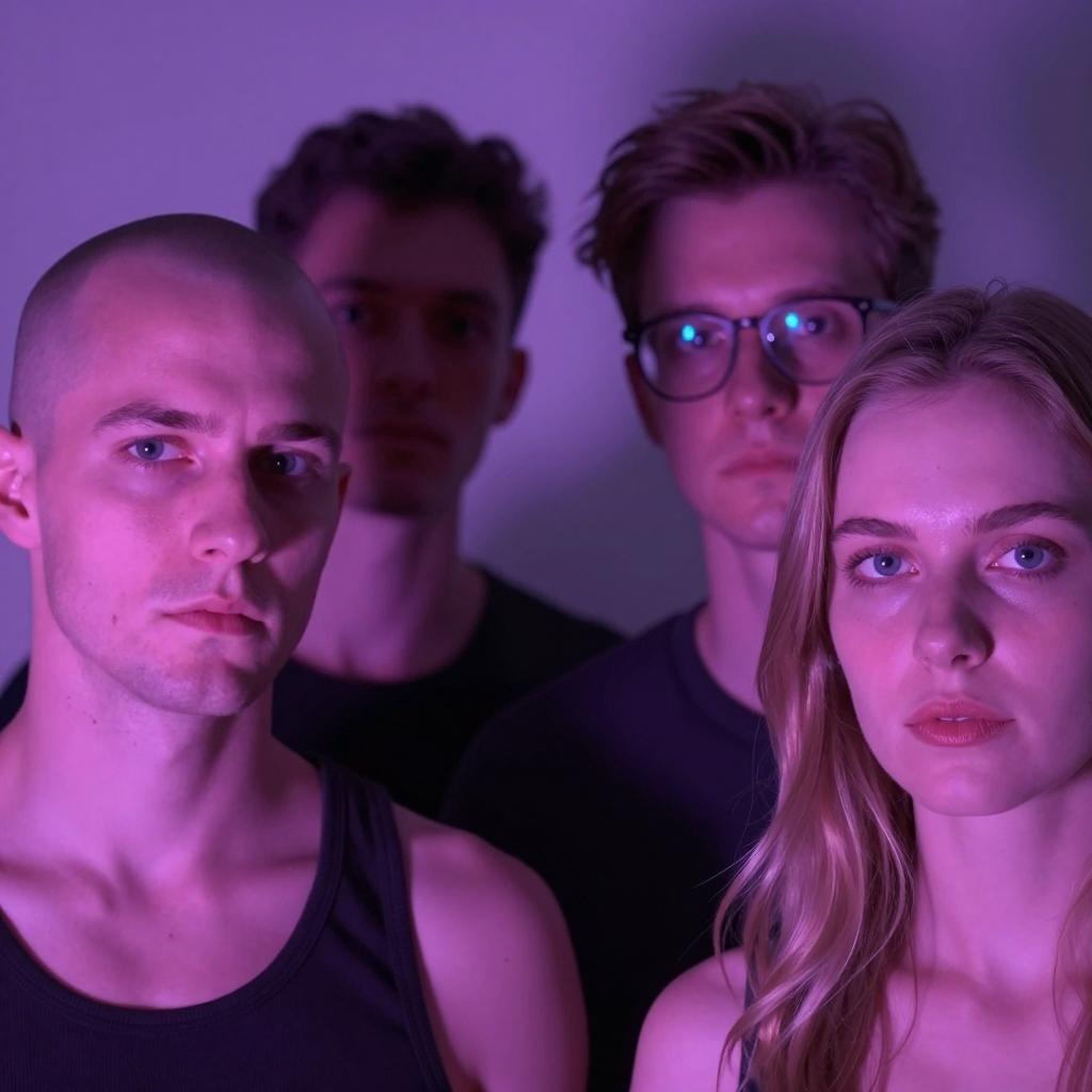 Photograph of five people's faces in close-up, illuminated by purple and pink light. A bald man in a tank top on the left, a man with glasses on the right, and three blurred men in the background. The blonde woman on the right gazes forward intently. Reflections and shadows add depth.