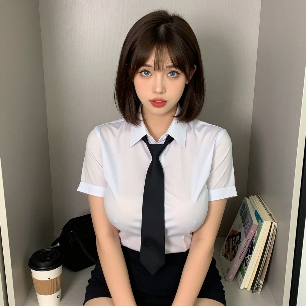This is a digitally rendered image of an Asian woman with fair skin and shoulder-length brown hair, wearing a white short-sleeved blouse, black tie, and black skirt. She has blue eyes, red lipstick, and a neutral expression. She is seated against a gray wall in a small, narrow space, with a white coffee cup and a stack of magazines on her right. A black bag is visible on her left. The image has a realistic yet slightly stylized appearance, with sharp details and vibrant colors. The woman's blouse is slightly fitted, accentuating her moderate breast size.