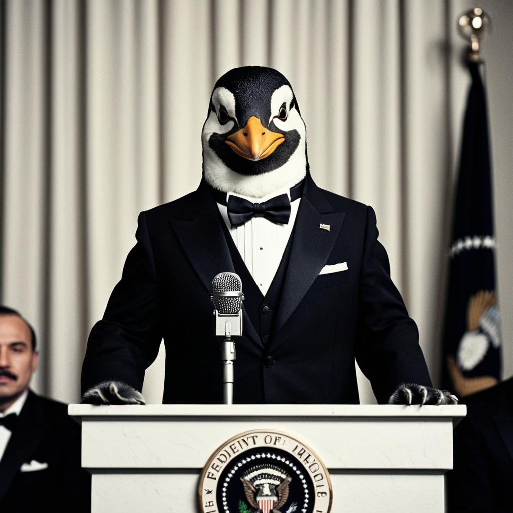 Anthropomorphic panther depicted as a president, wearing elegant double-breasted coat, with folded arms and a stern stare.