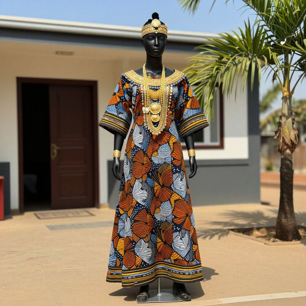 Photograph of a black mannequin wearing colorful, African-inspired traditional dress with orange, blue, and white patterns, adorned with gold jewelry, outdoors
