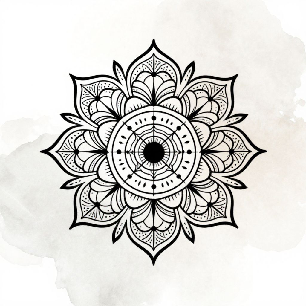 Timeless tattoo design featuring elegant black ink with intricate mandala patterns, blending ancient symbols and modern minimalism, set against a subtle watercolor background, capturing a sense of eternity and personal journey.