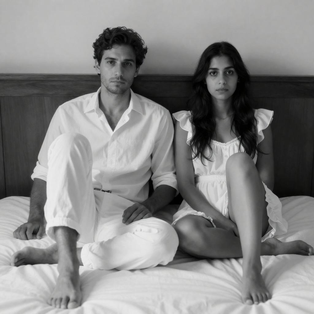 Photograph of a woman with medium brown skin and dark hair, wearing an off-shoulder white top, sitting on a bed with white stuffed animals. A man with long dark hair and a beard, dressed in black with white pinstripes, kneels beside her, holding a camera. The background features a ured white wall with black-and-white framed photos.