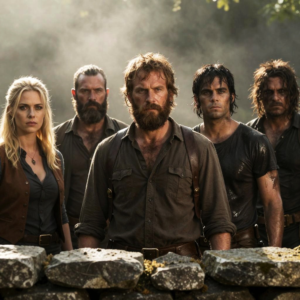 Movie poster for "Captain Blood," directed by Michael Curtiz. Three men in foreground: shirtless man with beard, shirtless man with blonde hair, and bearded man in green shirt leaning over unconscious woman. Large ship in background. Red and blue color scheme. Bearded man in red background image. Intense expressions. Three men in total.