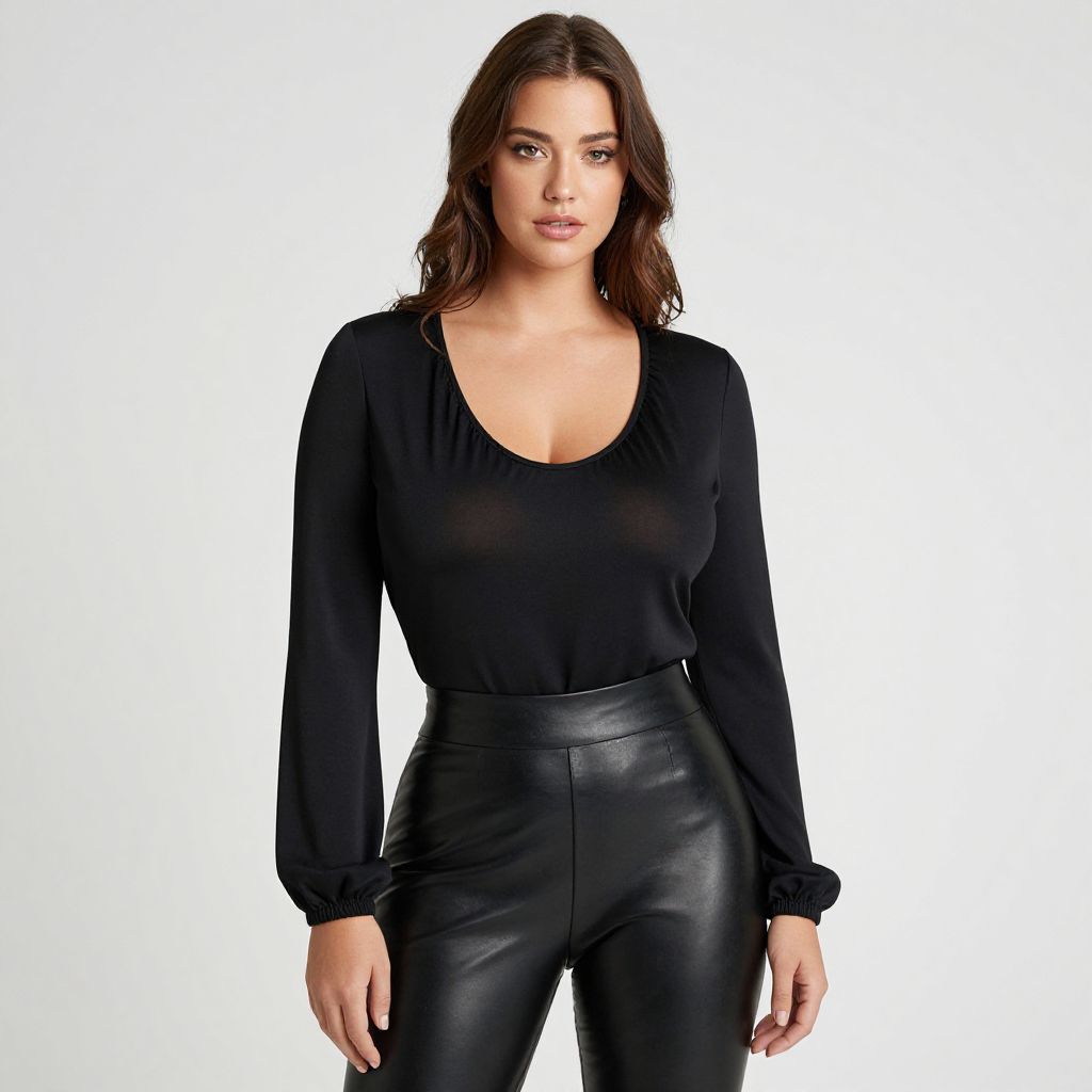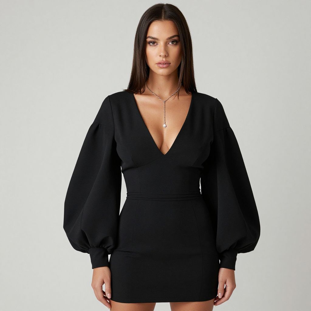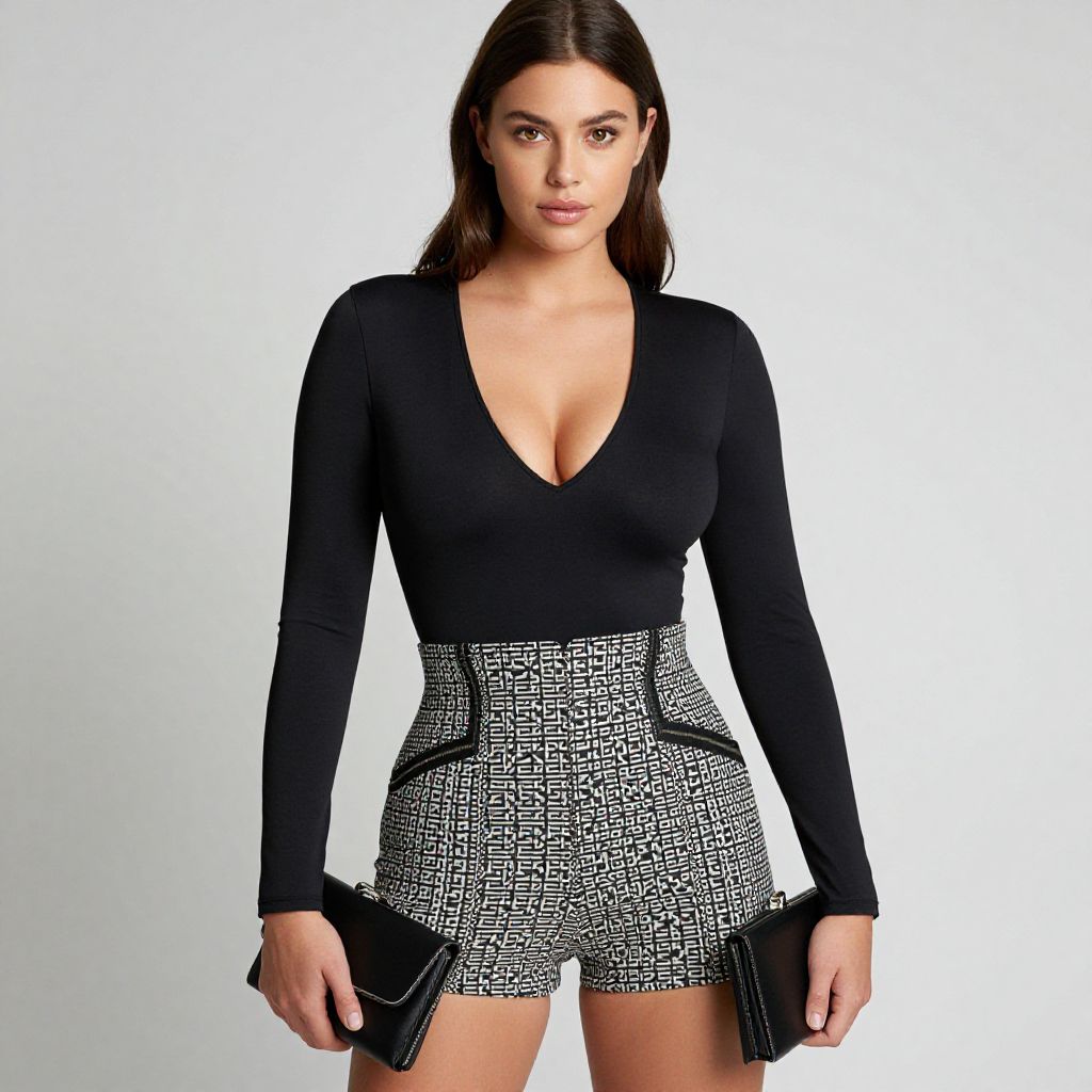 "Woman, chic, black deep V-neck bodysuit, long sleeves, fitted silhouette, paired with geometric patterned shorts in black and white, high-waist cut, zipper accents, black clutch with a minimalist design.. Sexy. Pretty face and beаutiful eyes. Big breasts."