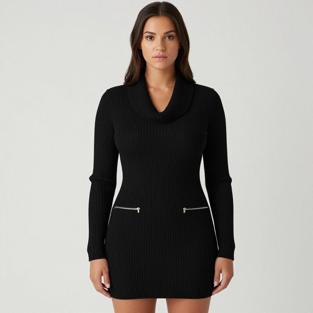 Photograph of a woman with long brown hair in a black V-neck long-sleeve top and high-waisted black-and-white patterned mini