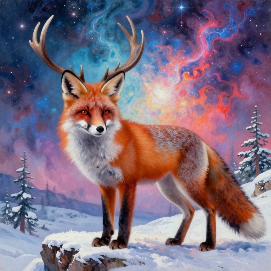 Digital artwork of a red fox with antlers standing on snow, against a vibrant, cosmic night sky with colorful nebulae. Snow-covered pine trees