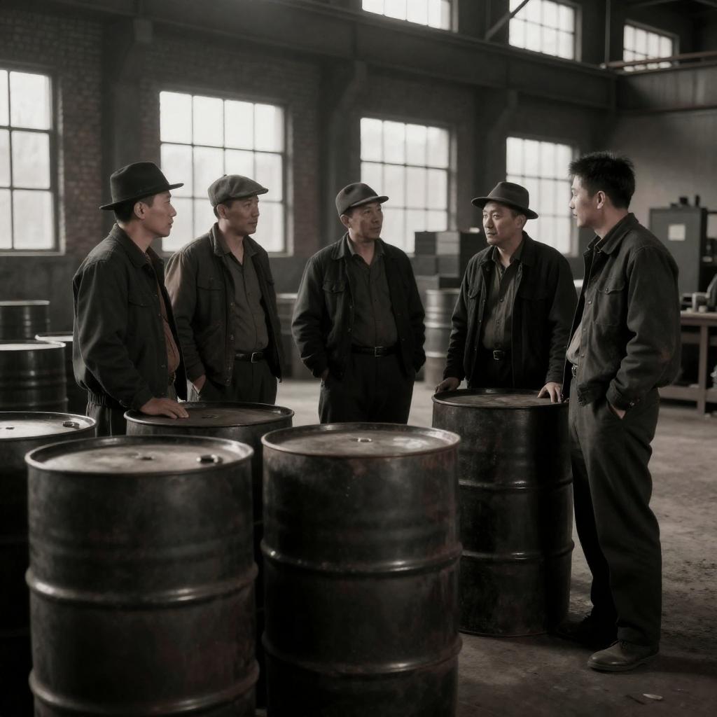 Photograph of five men in an industrial warehouse with brick walls and large windows. They wear dark, rugged clothing and hats. The foreground features large, cylindrical barrels. The men stand around, some holding barrels, engaged in conversation. The background includes stacked crates and industrial equipment. The lighting is dim, creating a gritty, vintage atmosphere.