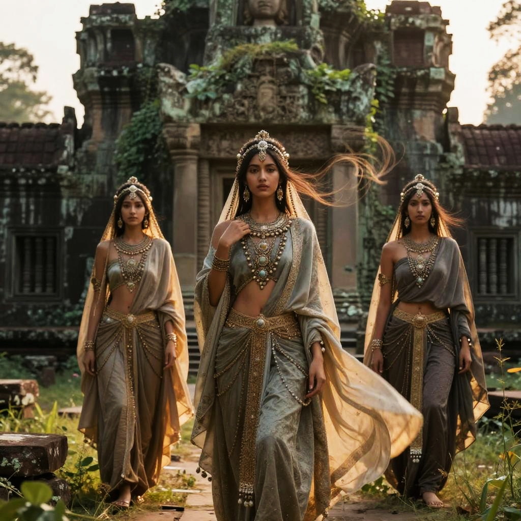 Scantilly clad women in ancient ancient temple ruins, golden hour light, intricate jewelry, nature overgrowth, soft breeze effect, artistic composition, fine art photography style