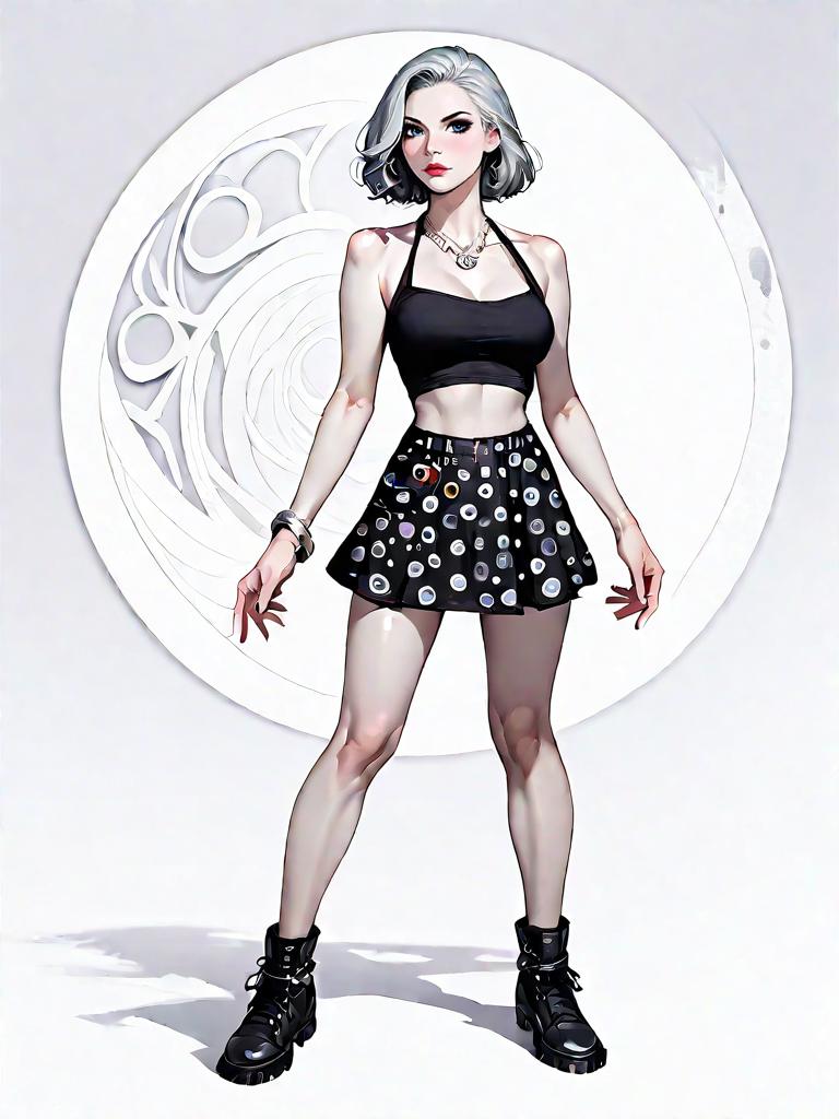 Full body digital illustration of a stylish young woman with short silver hair, wearing a navy halter neck crop top and a black patterned mini skirt with white and colorful geometric circle design. She accessorizes with a silver statement necklace featuring turquoise accents, a silver bangle, and black combat boots. The background features a subtle artistic white circular design.