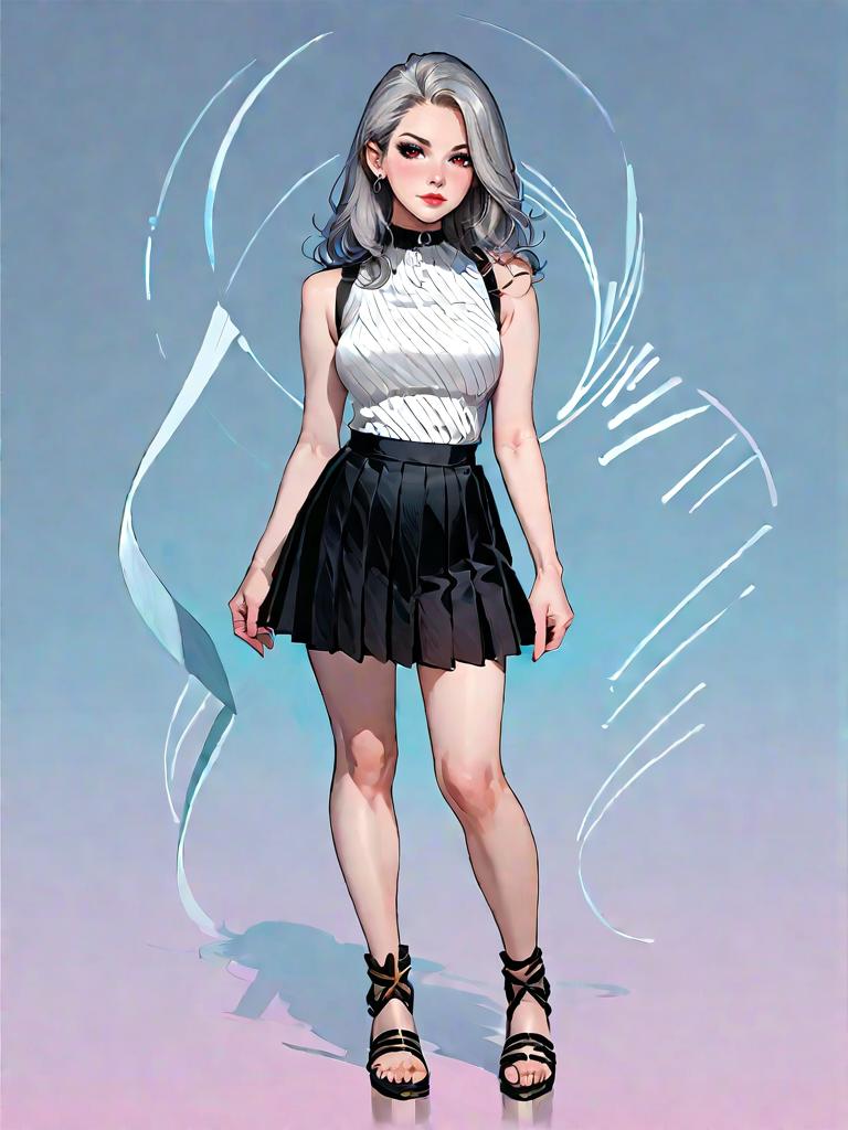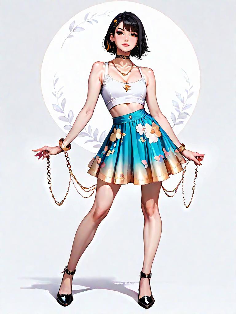 1girl, source_comics, realistic face, full body shot, Woman, casual chic, navy halter neck crop top, patterned mini skirt with black and white geometric design, silver statement necklace with turquoise accents, silver bangle on one wrist.