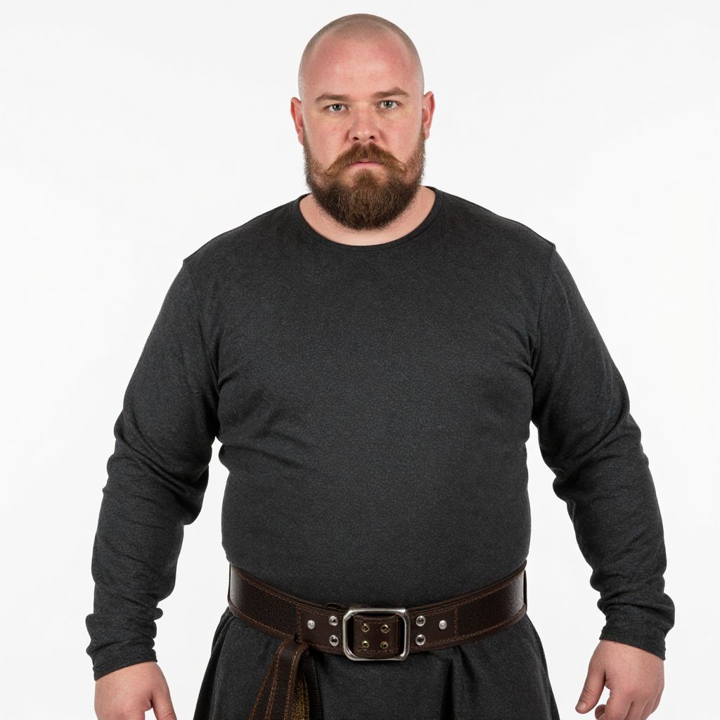 Photograph of a bald, bearded Caucasian man with a fair complexion, standing against a plain white background. He has a stocky build and is wearing a black, long-sleeved shirt and black pants secured with a dark brown leather belt featuring a large, silver buckle. His expression is neutral, and he gazes directly at the camera. The texture of his shirt appears slightly coarse, and the leather belt has visible stitching and a slight sheen. The overall style is simple and functional, with a medieval or warrior-like aesthetic.