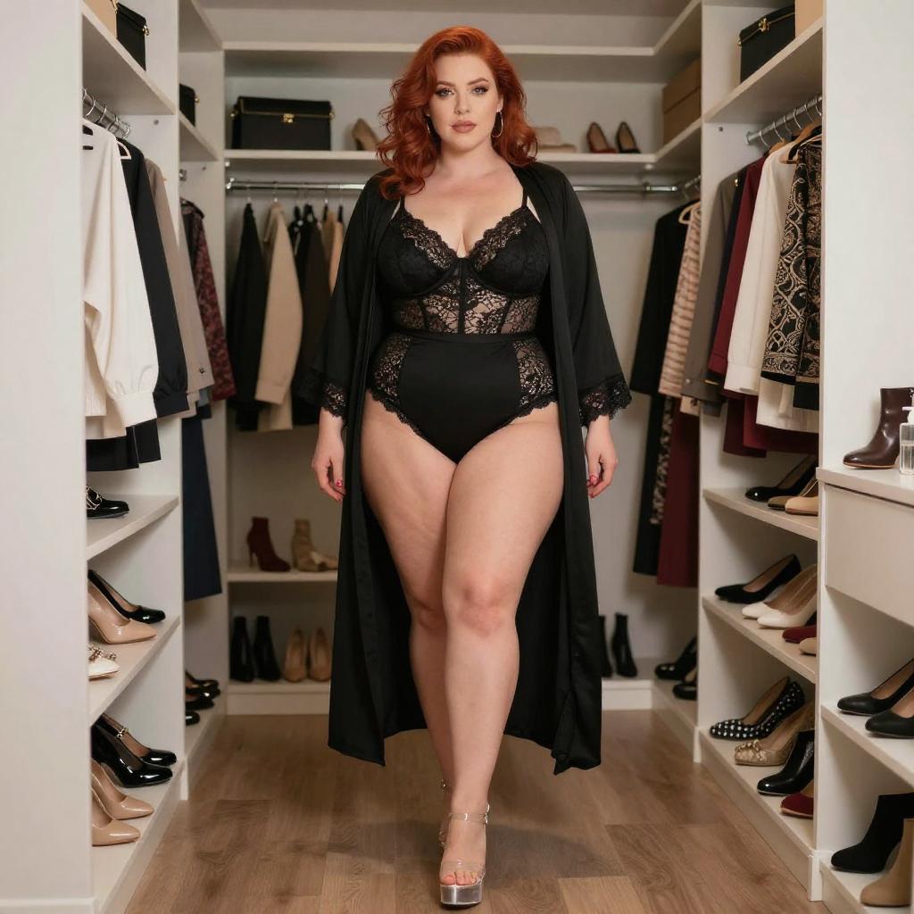 Photograph of a curvy, fair-skinned woman with red hair, wearing a black lace bodysuit with a deep neckline, sheer mesh panels, and a long black robe. She stands confidently in a well-lit, organized walk-in closet, wearing clear platform heels. Shelves and clothing racks filled with shoes and garments are in the background.