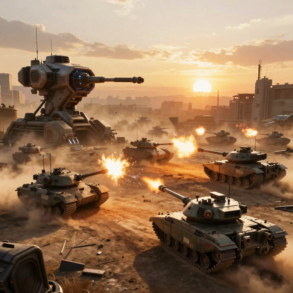 Bl2 atmospheric sci-fi battlefield at sunset with multiple armored combatants and futuristic tanks engaging in a fierce firefight, dusty environment with scattered debris, dramatic shadows, high-resolution, dynamic and immersive scene