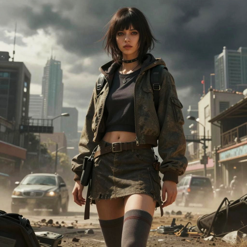 Hyper realistic, masterpiece, very detailed, sci-fi, dystopian, (beautiful eyes ), (bangs), brunette, Woman, detailed face, detailed skin, baggy clothes, thigh high socks, skirt, cyberpunk, soft light, subsurface scattering, ((skyline)), cumulonimbus clouds, busy street, polluted, dust