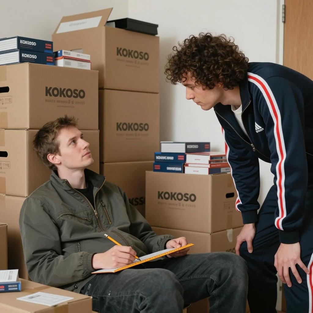 Black and white photograph. Four young men in a warehouse with stacked boxes. Left man in zipped jacket talks, right man in hooded sweatshirt smirks. Center man in tracksuit talks on phone, middle-right man in t-shirt listens. All stand close. Boxes labeled "Packaging" and "Crawford." Right man's arm extended towards middle-right man. All men have short hair. Background includes a dartboard.