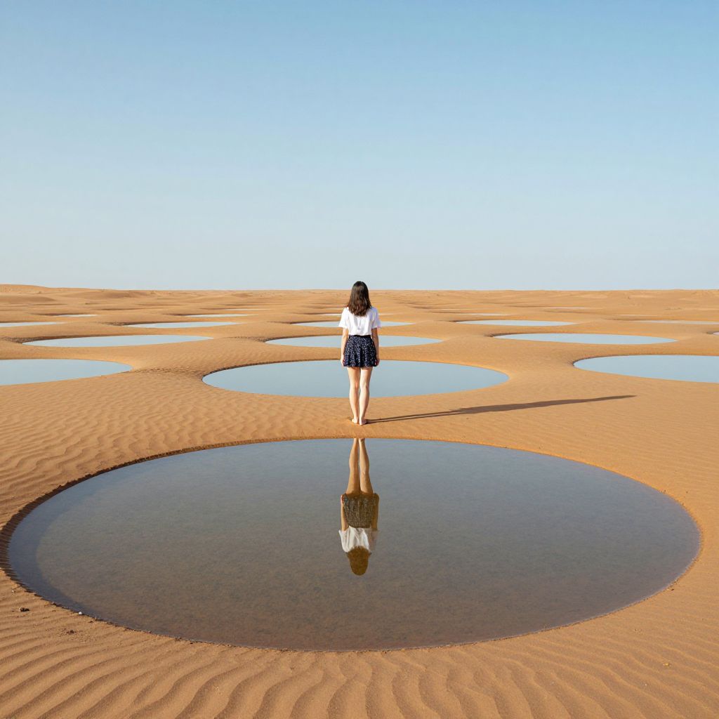 Woman stands barefoot on a vast expanse of desert, her reflection mirrored perfectly in circular pools of crystal-clear water that stretch endlessly toward the horizon, creating an illusion of infinite symmetry under a serene, cloudless sky.