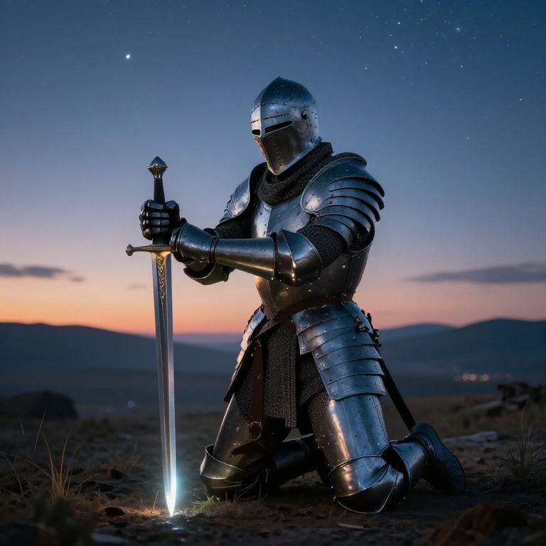 Kneeling crusader in full armor with a sword planted in the earth, under a twilight sky filled with stars, surrounded by an ethereal glow, reflecting on a silent war-torn landscape, detailed textures on the helmet and cuirass, mood of honor and reflection